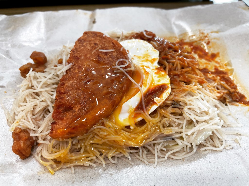 Well, my friend, that is a rice noodle fried beautifully in pork lard (a generous portion of it), a perfect sunny side up egg, a luncheon meat slice, and a solidly delicious kicka** chili.